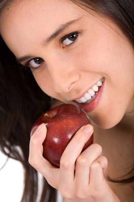 beautiful young girl eating a red apple