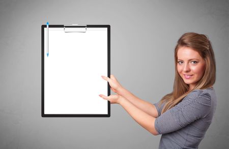 Beautiful young girl holding black folder with white sheet copy space