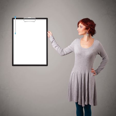 Beautiful young girl holding black folder with white sheet copy space