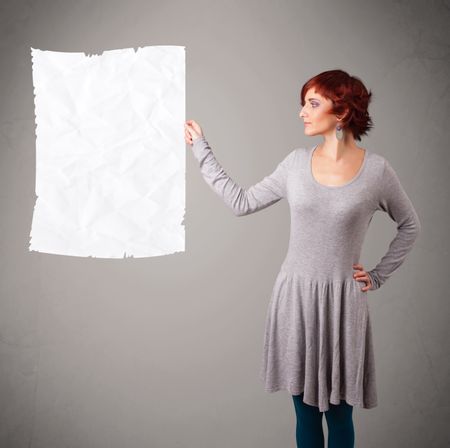 Beautiful young girl holding crumpled white paper copy space