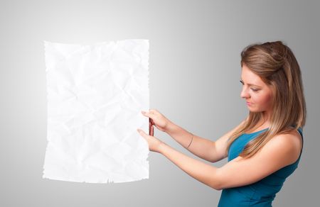 Beautiful young girl holding crumpled white paper copy space