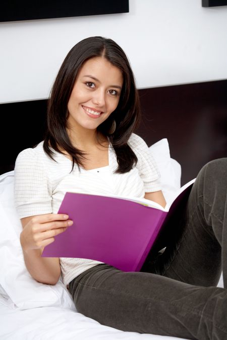 beautiful young girl reading a book at home