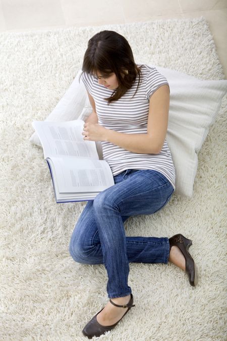 Beautiful young girl reading a book indoors