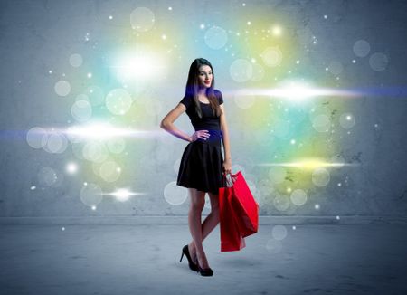 A beautiful young girl standing with long hair and red shopping bags in front of colorful light bokeh urban wall background concept