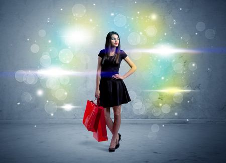 A beautiful young girl standing with long hair and red shopping bags in front of colorful light bokeh urban wall background concept