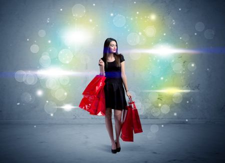 A beautiful young girl standing with long hair and red shopping bags in front of colorful light bokeh urban wall background concept
