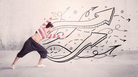 A beautiful young hip hop dancer dancing contemporary street dance in front of urban grey wall background with lines and arrows concept