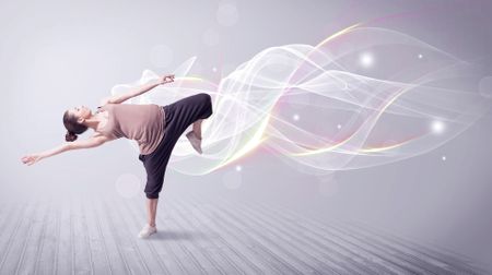 A beautiful young hip hop dancer dancing contemporary urban street dance in front of grey wall background with smokey lines and glitter concept.