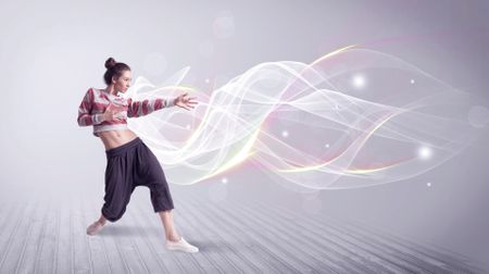 A beautiful young hip hop dancer dancing contemporary urban street dance in front of grey wall background with smokey lines and glitter concept.