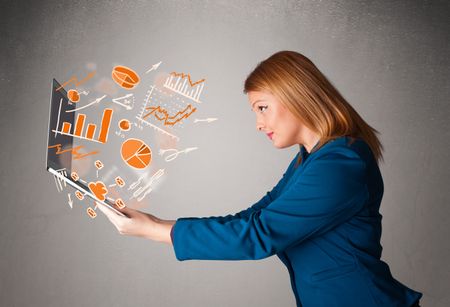 Beautiful young lady holding laptop with graphs and statistics