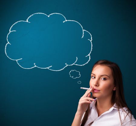 Beautiful young lady smoking cigarette with idea cloud