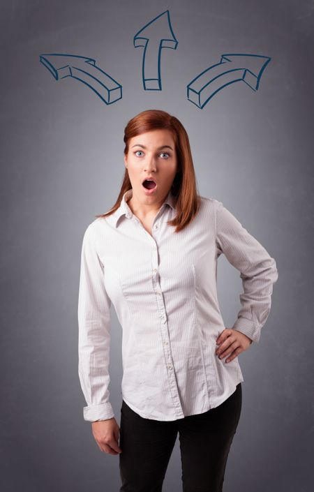 Beautiful young lady thinking with arrows overhead