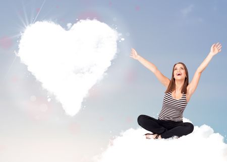 Beautiful young lovely woman sitting on cloud with heart