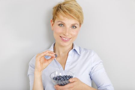Beautiful young woman in a casual shirt enjoying fresh Blueberries at home