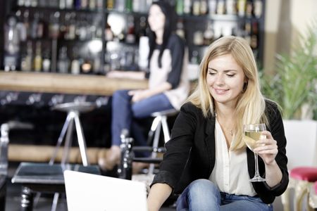 Beautiful young woman chatting with friends on her laptop while enjoying a glass of wine in a bar