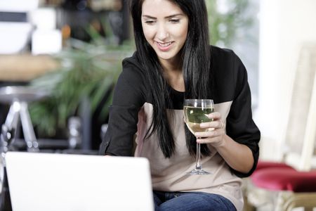 Beautiful young woman chatting with friends on her laptop while enjoying a glass of wine in a bar