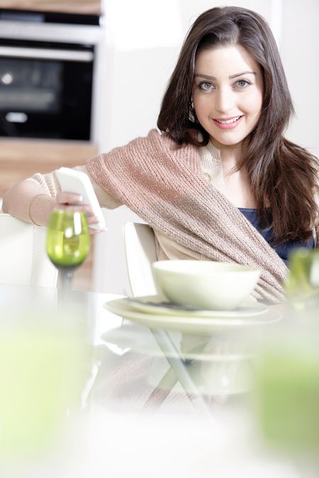 Beautiful young woman chatting on her mobile phone in her kitchen