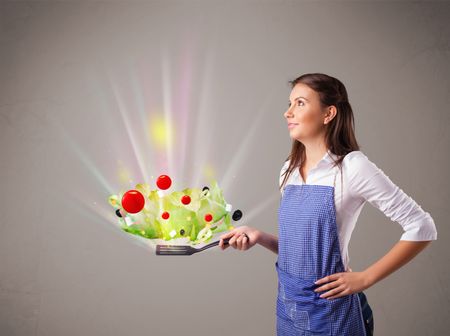 Beautiful young woman cooking fresh vegetables with abstract lights