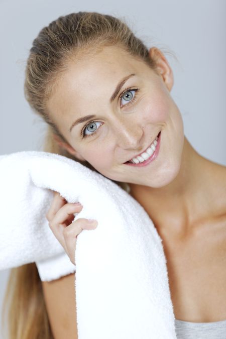 Beautiful young woman cooling off after exercising with a towel.