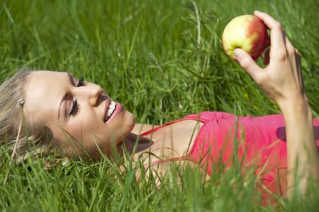 Beautiful young woman eating an apple on a summers day in the countryside.
