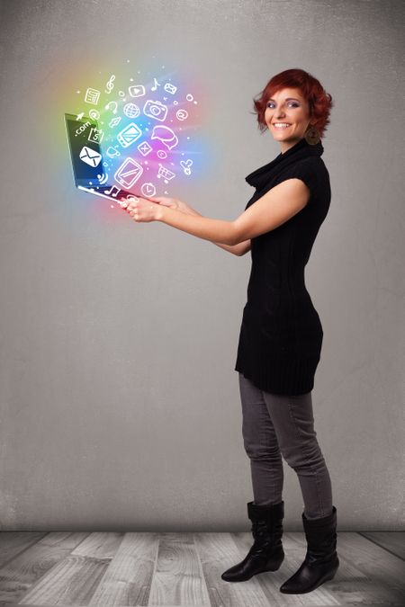 Beautiful young woman holding notebook with colorful hand drawn multimedia icons