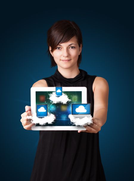 Beautiful young woman holding tablet with modern devices in clouds