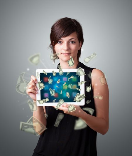 beautiful young woman holding tablet with money