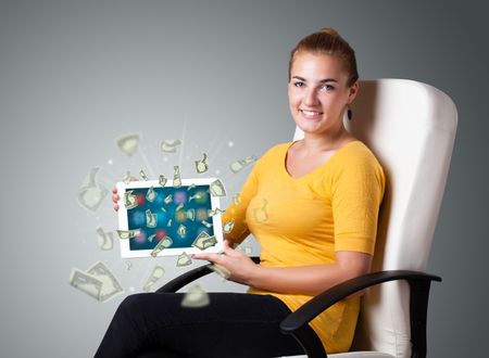 beautiful young woman holding tablet with money