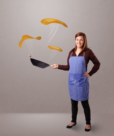 Beautiful young woman making pancakes