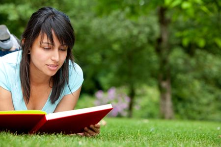 Beautiful young woman reading a book outdoors