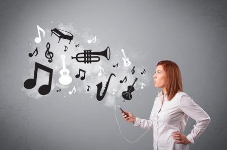 Beautiful young woman singing and listening to music with musical notes and instruments getting out of her mouth