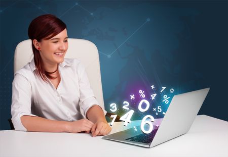 Beautiful young woman sitting at desk and typing on laptop with 3d numbers comming out