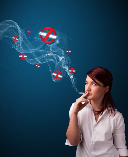 Beautiful young woman smoking dangerous cigarette with no smoking signs
