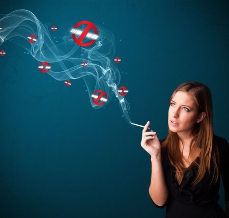 Beautiful young woman smoking dangerous cigarette with no smoking signs