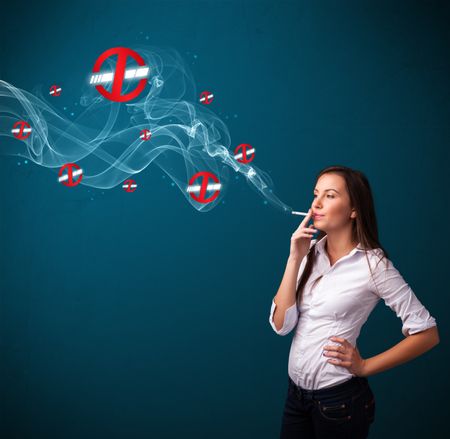 Beautiful young woman smoking dangerous cigarette with no smoking signs