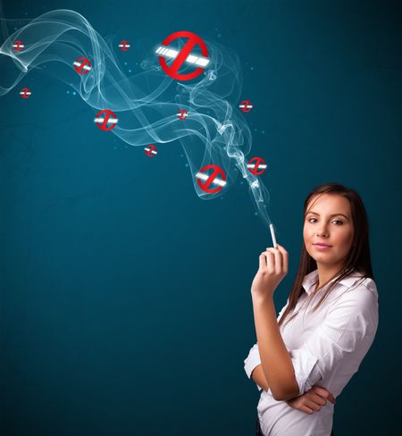 Beautiful young woman smoking dangerous cigarette with no smoking signs