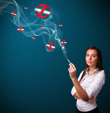Beautiful young woman smoking dangerous cigarette with no smoking signs