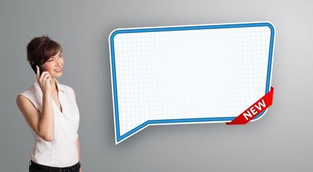 Beautiful young woman standing next to a modern speech bubble copy space and making phone call