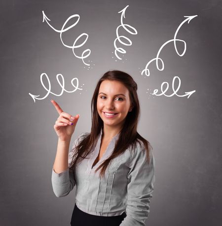 Beautiful young woman thinking with arrows overhead