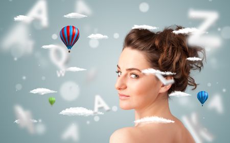 Beautiful young woman with wellness and healthcare clouds on gradient background