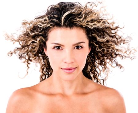 Beauty female portrait with curly hair in the wind - isolated over white