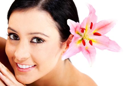 Beauty portrait of a woman with a flower on her head - isolated over a white background