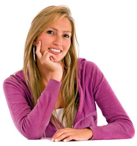 beauty woman portrait leaning on a table - isolated