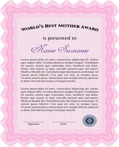 Best Mother Award Template. With guilloche pattern. Elegant design. Vector illustration.