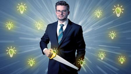 Better-looking businesman holding tool with idea bulbs concep