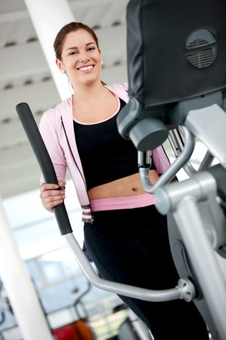 Beutiful gym woman exercising on a cardio machine smiling