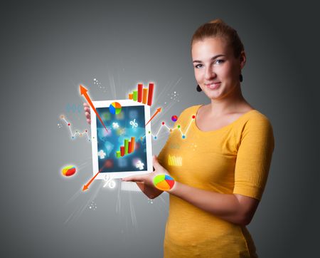 beutiful woman holding modern tablet with colorful diagrams and graphs