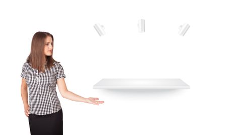 Beutiful young woman presenting modern copy space isolated on white