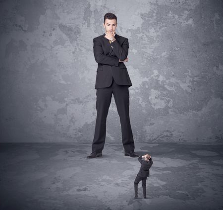 Big angry boss looking at tiny coworker concept on background