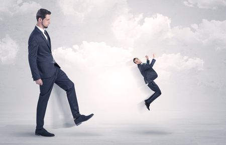 Big businessmen kicking himself as a small employee with cloudy background
